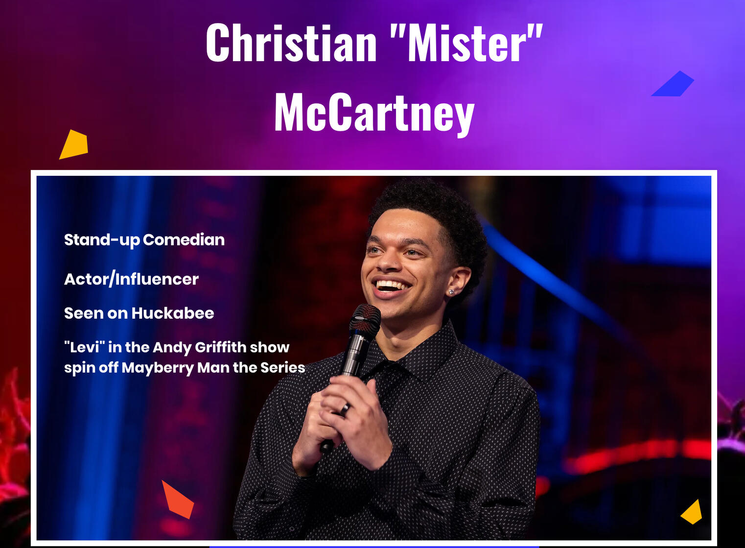 Christian McCartney just won the comedy award at the Cheer Choice Awards in Las Vegas. He began entertaining family members and guests when he was in pre-school, which is also when he began studying greats such as Jim Carrey, Tommy Davidson and the Wayans brothers on In Living Color. He began doing standup at age 19 in Baltimore, Maryland. His comedy is a combination of animated storytelling, energetic characters, and pure entertainment. Christian can be seen live on stage touring the country as well as on Instagram, Facebook, and Tiktok where he has over 5 million followers from around the world. Christian has also portrayed Levi in the series spin off of the Andy Griffith Show known as Mayberry Man. In January of 2024 he made his TV debut as a special guest performer on Huckabee on the Trinity Broadcasting Network. Two weeks after Huckabee, Christian headlined the FedEx Forum in Memphis Tennessee for the Memphis Grizzlies Faith and Family Night. "I love seeing people smile and God has blessed me with the ability to do that." Christian's Mission Statement: Laughter is the best medicine, but Jesus Christ is the only healer!